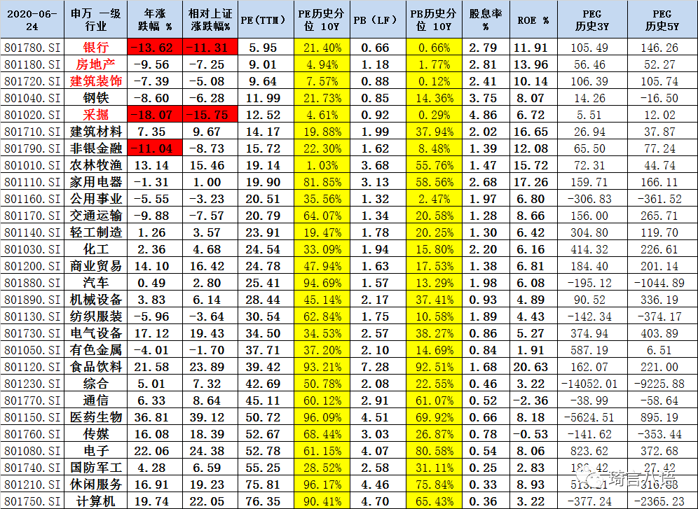 附一:申萬一級行業 漲跌幅、估值、股息率、ROE等數據