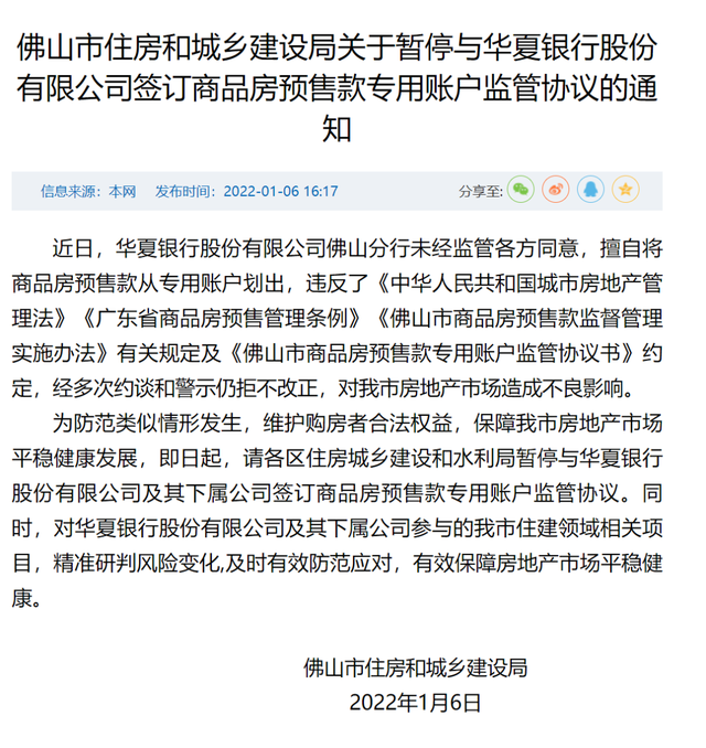 1月6日,華夏銀行佛山分行被佛山市住建局通報(bào),起因是其未經(jīng)監(jiān)管各方同意,擅自將佳兆業(yè)悅峰項(xiàng)目的商品房預(yù)售款從專用賬戶劃出,違反規(guī)定且拒不改正。