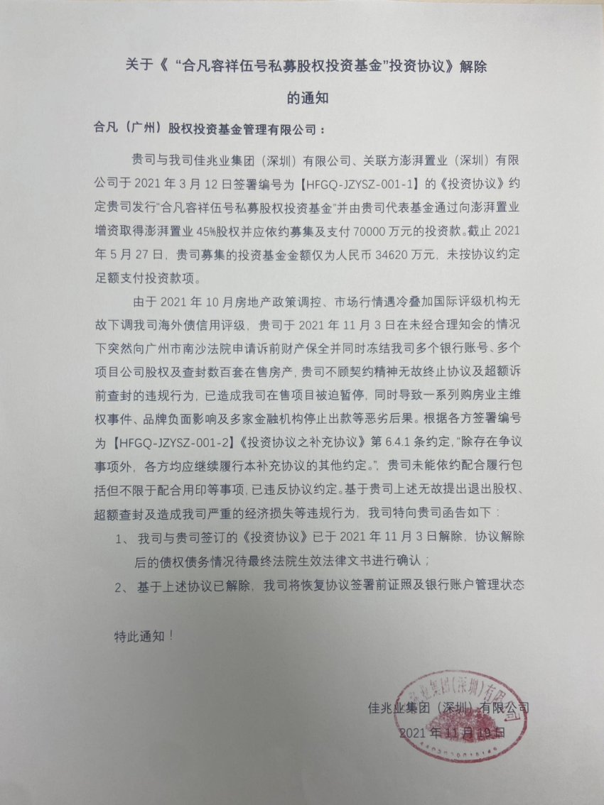 隨后,一份佳兆業(yè)與合凡解除投資協(xié)議的公告刷屏。公告中,佳兆業(yè)訴合凡未按協(xié)議約定足額支付投資款項(xiàng),違規(guī)超額訴前查封在售房產(chǎn)等,造成了惡劣后果。