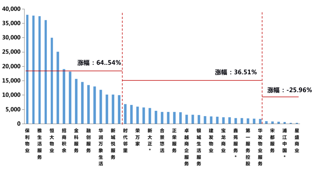 經(jīng)歷了2020年的上市潮,物管行業(yè)在資本市場(chǎng)的整體表現(xiàn)正在趨于理性。2019年24家上市物企全年股價(jià)漲幅均值為58.02%,到了2020年,上市物企數(shù)量達(dá)到42家,整體股價(jià)漲幅均值卻降為21.55%,其中僅有15家股價(jià)漲幅超過均值,超6成物業(yè)股股價(jià)漲幅低于板塊均值。