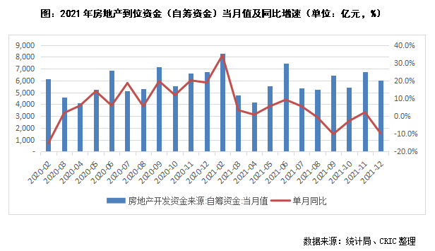 從自籌資金來看,12月房地產開發企業到位資金——自籌資金為6050億元,同比下降9.8%,較2019年同期增長7.1%,同比增速在11月由負轉正后再次回負。全年來看,2021年累計值達到65428億元,同比增長3.2%,增幅較前11月的4.8%進一步收窄,在當前整體融資環境收緊下,多個融資渠道均被封堵,雖部分企業通過多種方法自救充裕現金流,但大部分房企自有籌集資金能力有限,資金增幅有限。