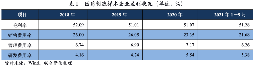 從醫藥制造業的上市公司數據分析[1]來看,在盈利能力方面,2018-2020年,醫藥制造樣本企業毛利率較為穩定。2018-2020年及2021年1-9月,醫藥制造樣本企業銷售費用率波動下降。2018-2020年,醫藥制造樣本企業管理費用率持續上升。2021年1-9月,醫藥制造樣本企業管理費用率為6.26%,較上年同期下降0.37個百分點。2018-2020年及2021年1-9月,醫藥制造樣本企業研發費用率持續上升。整體看,醫藥制造樣本企業毛利率保持在較高水平,銷售費用率波動下降。