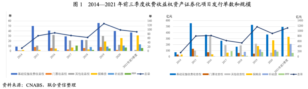 從市場(包含交易所市場和銀行間市場)發(fā)行情況來看,2014—2020年,收費(fèi)收益權(quán)資產(chǎn)證券化項目共發(fā)行529單,發(fā)行金額為4979.52億元。其中,基礎(chǔ)設(shè)施收費(fèi)收益權(quán)資產(chǎn)證券化項目發(fā)行單數(shù)與金額占比最高。2021年1—9月,收費(fèi)收益權(quán)資產(chǎn)證券化項目共發(fā)行89單,發(fā)行金額為1110.38億元。2018—2020年,由于《負(fù)面清單》中明確指出“已納入國家保障房計劃且已開工建設(shè)的保障房不列入負(fù)面清單,可以作為基礎(chǔ)資產(chǎn)發(fā)行ABS”,因此在城投企業(yè)融資受限的大背景下,保障房成為了一個較好的突破口,使得保障房項目發(fā)行單數(shù)與金額均有所增加。2019—2020年,由于《資產(chǎn)證券化監(jiān)管問答(三)》的發(fā)布,對電影票款、入園憑證、物業(yè)服務(wù)費(fèi)、缺乏實質(zhì)押品的商業(yè)物業(yè)租金等現(xiàn)金流不具有穩(wěn)定的項目提出了發(fā)行限制,其他類收費(fèi)權(quán)項目發(fā)行單數(shù)與金額均呈現(xiàn)大幅減少的態(tài)勢,具體發(fā)行情況如下圖所示。