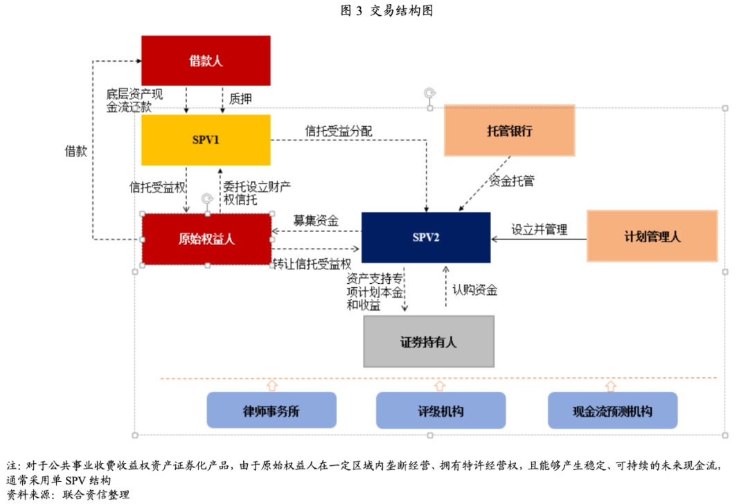 收費(fèi)收益權(quán)是一種約定權(quán)利,即交易雙方根據(jù)基礎(chǔ)權(quán)利和交易所創(chuàng)制的一項約定權(quán)利,其本質(zhì)是通過結(jié)構(gòu)化的設(shè)計將未來一段時期的收費(fèi)收益權(quán)利所產(chǎn)生的現(xiàn)金流提前變現(xiàn)。由于收費(fèi)收益權(quán)資產(chǎn)證券化產(chǎn)品涉及的基礎(chǔ)資產(chǎn)會存在難以特定化、現(xiàn)金流回款時間與資產(chǎn)支持證券還本付息時間錯配或其他瑕疵,所以通常情況下采用雙SPV結(jié)構(gòu),其中SPV1通常為財產(chǎn)權(quán)信托,SPV2為資產(chǎn)支持專項計劃或資產(chǎn)支持票據(jù)信托,交易結(jié)構(gòu)圖如下圖所示。