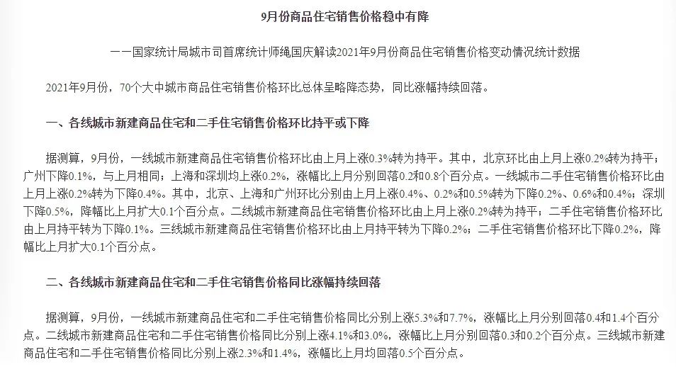 10月20日,我國統(tǒng)計(jì)局發(fā)布了9月70城房價有關(guān)數(shù)據(jù)。