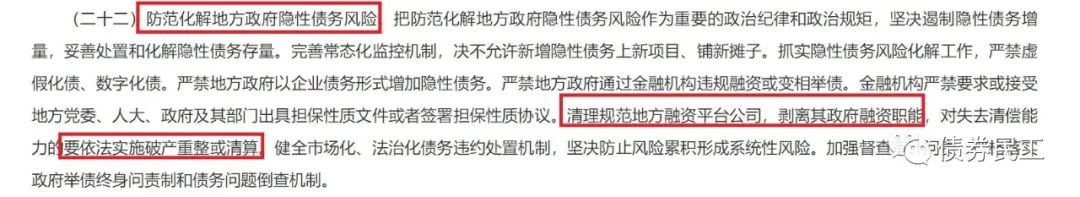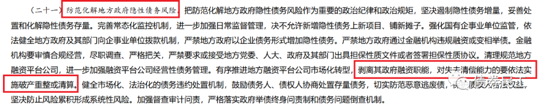 但是,這并不是監管文件中第一次提出這個說法。2021年4月13日,國務院印發了《關于進一步深化預算管理制度改革的意見》(國發[2021]5號),已經明確提出“清理規范地方融資平臺公司,剝離其政府融資職能,對失去清償能力的要依法實施破產重整或清算”。
