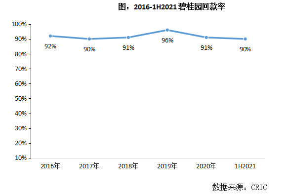 企業(yè)層面,樣本企業(yè)中35家房企的經(jīng)營(yíng)性現(xiàn)金流凈額同比發(fā)生了增長(zhǎng)且為凈流入狀態(tài),其中同比增長(zhǎng)最多的是碧桂園,同比增加265億元。碧桂園自2019年開(kāi)始就以回款為行政考核標(biāo)準(zhǔn),回款率已經(jīng)連續(xù)6年保持在90%及以上。2021年上半年,碧桂園權(quán)益物業(yè)銷售現(xiàn)金回款2727.9億元,權(quán)益回款率為90%。該考核制度下,對(duì)于形成企業(yè)內(nèi)部回款秩序、提升效率都起到良好的促進(jìn)作用,得以保證現(xiàn)金流風(fēng)險(xiǎn)可控、經(jīng)營(yíng)穩(wěn)定。