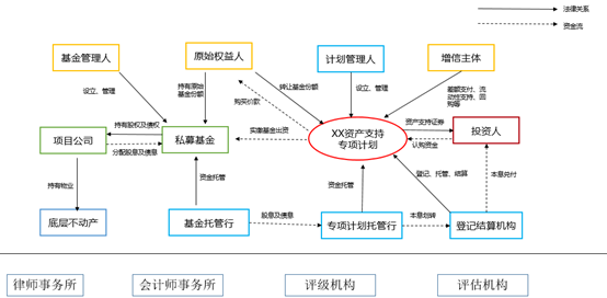 通過系列資產(chǎn)重組安排,實(shí)現(xiàn)私募基金持有項(xiàng)目公司的股權(quán)和債權(quán),項(xiàng)目公司持有物業(yè)資產(chǎn)的結(jié)構(gòu)。資產(chǎn)管理人向投資者募集資金設(shè)立專項(xiàng)資產(chǎn)支持計(jì)劃,并發(fā)行資產(chǎn)支持證券。管理人以認(rèn)購(gòu)資金向原始權(quán)益人購(gòu)買原始權(quán)益人持有的基金份額及其相關(guān)附屬擔(dān)保權(quán)益(如有),實(shí)現(xiàn)基礎(chǔ)資產(chǎn)由原始權(quán)益人向?qū)m?xiàng)計(jì)劃的轉(zhuǎn)讓。