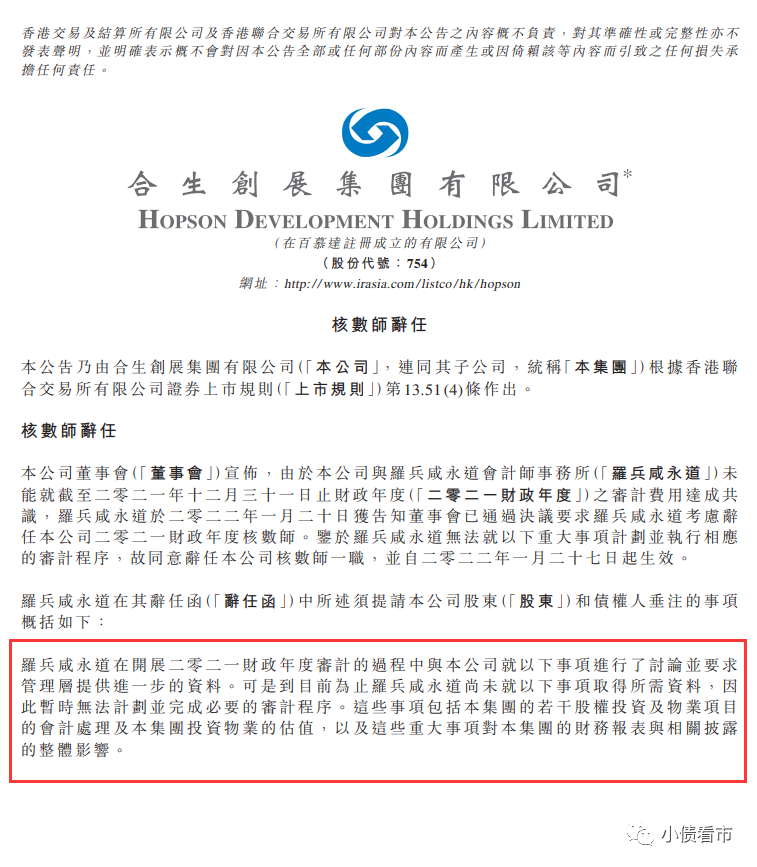 值得注意的是,除了提到與會(huì)計(jì)師事務(wù)所在費(fèi)用上存在分歧之外,合生創(chuàng)展還稱未按照前任審計(jì)師要求提供信息。