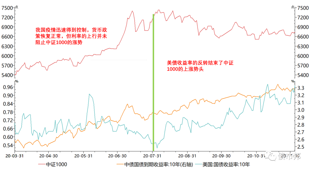 在此期間,中證1000指數卻還在持續走牛,從5500點抬升到7300點。因為美債的收益率還在探底。