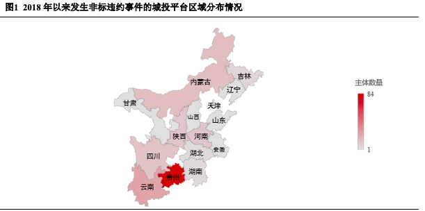 2018年以來,城投平臺非標違約事件頻繁發(fā)生,2019年為城投非標違約事件爆發(fā)的高峰期,2020年非標違約事件數量有所下降,2021年再次走高,新增非標違約主體(包括融資方和擔保方,下同)數量表現趨同。依據公開資料統計,截至2021年11月底,累計170余家城投平臺發(fā)生非標違約事件,涉及15個省、自治區(qū)及直轄市。從區(qū)域分布來看,貴州省為全國發(fā)生非標違約事件的城投平臺數量最多的地區(qū),超過80家;云南省、內蒙古、四川省、陜西省、河南省發(fā)生非標違約事件的城投平臺超過10家;吉林省、湖南省、天津市、湖北省發(fā)生非標違約事件的平臺數量不超過5家。