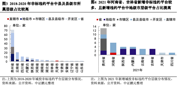 一、2021年新增城投非標違約平臺及事件數量均較上年有所增加,除貴州省、云南省、內蒙古、陜西省等非標違約重災區(qū),河南省、吉林省新增非標違約平臺較多,且地級市平臺出現非標違約或輿情事件比例提高,發(fā)生信用風險事件的主體行政層級向上蔓延