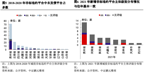 從非標違約平臺的主體級別來看,2021年新增的非標違約平臺仍以未評級為主,占比65.71%,其次為AA平臺,占比25.71%,級別分布趨勢與往年相似。2021年貴州省、甘肅省、內蒙古分別有5家、1家和1家城投平臺出現主體評級下調情況,這些平臺均為已發(fā)生非標違約事件的平臺。