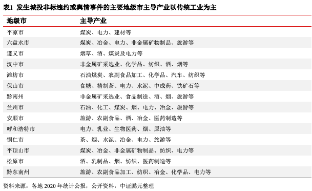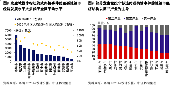 從經濟發(fā)展水平來看,除發(fā)生輿情事件的濰坊市外,其余發(fā)生非標違約或輿情事件的主要地級市2020年GDP全部在4,000億元以下,且同期地區(qū)人均GDP基本低于全國人均GDP,地區(qū)經濟發(fā)展水平較低。從產業(yè)結構來看,發(fā)生城投非標違約或輿情事件的地級市基本以第二、三產業(yè)為主導,所從事產業(yè)基本為煤炭、煙、酒等傳統產業(yè),部分地區(qū)工業(yè)基礎薄弱或轉型壓力大,工業(yè)對經濟貢獻不高,產業(yè)結構以第三產業(yè)為主導,典型地區(qū)包括平涼市、松原市、黔東南州、蘭州市、呼和浩特市等地。例如,蘭州市地處內陸,工業(yè)以石油、化工等傳統產業(yè)為主,產業(yè)轉型壓力大,第三產業(yè)以房地產、金融、批發(fā)零售、文旅產業(yè)為主,2020年第三產業(yè)在三次產業(yè)結構中占比65.68%;呼和浩特市地處中國北部邊疆,依托當地資源稟賦,工業(yè)以乳業(yè)、電力、生物制藥、原油等傳統產業(yè)為主,工業(yè)經濟增長乏力,經濟以第三產業(yè)為主導,房地產、文旅產業(yè)發(fā)展較好。