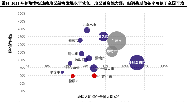 注:上圖中氣泡大小代表以地方非金融企業(yè)及機關團體貸款余額衡量的地方融資能力,融資能力越強,氣泡越大。藍色氣泡為2020年及以前發(fā)生非標違約事件的地區(qū),紅色氣泡為2021年新增非標違約地區(qū),灰色氣泡為2021年發(fā)生輿情事件的典型地區(qū)。原點坐標軸為全國平均值(100%,184.56%)。