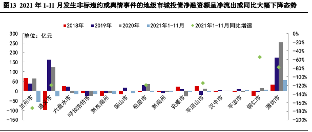 此外,前文關注到2021年河南省非標違約事件顯著增加,發(fā)生非標違約事件的地區(qū)主要為河南省平頂山市,且河南省焦作市也開始出現非標違約事件。究其原因,2020年11月河南省級國有企業(yè)永城煤電控股集團有限公司超短期融資券違約,“無序違約”引發(fā)市場震驚,永煤事件發(fā)生后至2021年1月下半旬河南省內均未有城投債發(fā)行,且2021年1-11月河南省城投債凈融資同比下滑38.21%,地區(qū)國有企業(yè)信用風險事件引發(fā)的連鎖反應導致區(qū)域內城投融資受阻,也增加了區(qū)域內城投信用風險事件發(fā)生的可能性。