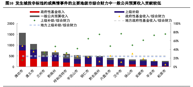 2、財政特征:地方政府綜合財力中一般公共預算收入占比較低,上級補助或土地財政貢獻較大,2021年房地產監(jiān)管政策收緊易對土地出讓金依賴度高地區(qū)形成沖擊;