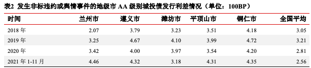 2021年以來城投融資政策趨緊。直接融資方面,2021年城投債申報審批政策有所收緊,年初交易所、交易商協會依據債務風險等情況將城投公司劃分至不同檔位,且不同檔位對應不同的募集資金用途,部分被劃分至“紅檔”或“一類”的城投公司債券募集資金用途限制為償還對應場所即將到期的債券,該類城投整體債券凈融資規(guī)模壓縮。2021年1-11月,發(fā)生非標違約或輿情事件的城投債凈融資情況見下表,平涼市、銅仁市及濰坊市城投債融資呈凈流入狀態(tài),但凈融資規(guī)模均較上年同期大幅下滑,漢中市自2020年以來已無公開債券市場融資,其余發(fā)生非標違約或輿情事件的地級市城投債凈融資額均呈凈流出狀態(tài)。表2選取2021年1-11月城投債發(fā)行規(guī)模相對較大的地區(qū)進行利差分析,除濰坊市外,2021年1-11月AA級別城投債發(fā)行利差均較上年有所上行,而全國同級別AA城投利差處于下行態(tài)勢,市場投資者對該類地區(qū)認可度下降。