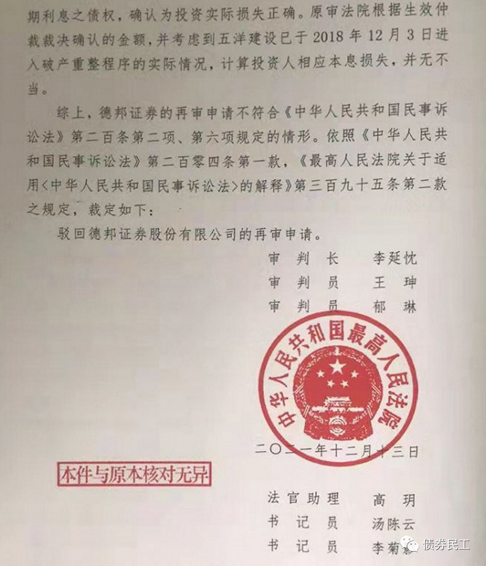 根據(jù)界面新聞2021年12月20日的報(bào)道,最高人民法院于12月13日駁回了德邦證券的“五洋債”再審申請(qǐng)。