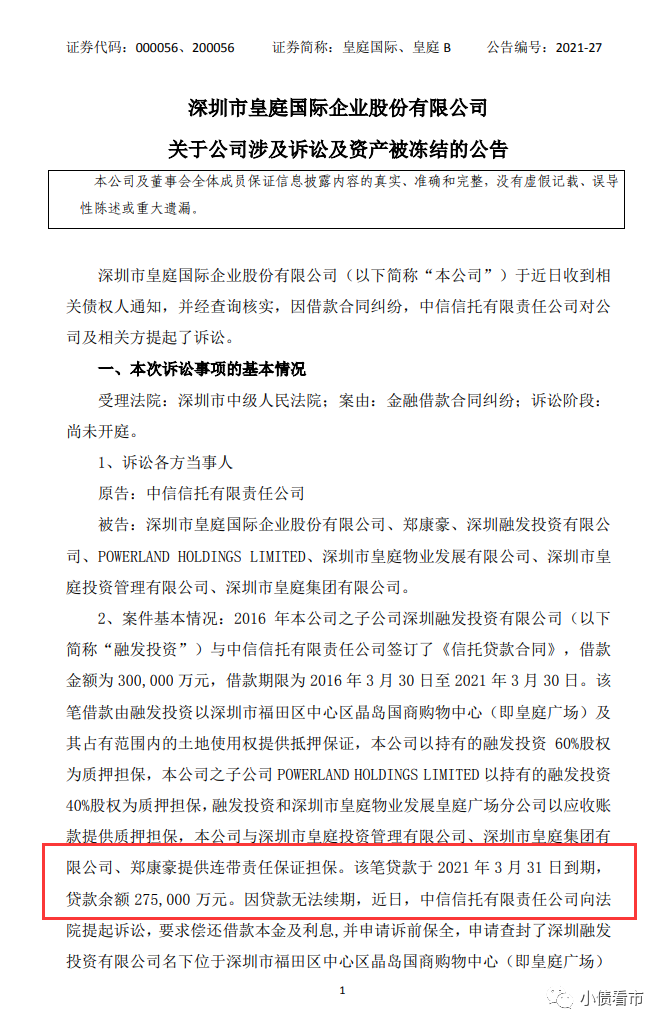 據悉,2016年皇庭國際子公司融發投資與中信信托簽訂了《信托貸款合同》,借款金額為30億元。該筆貸款已于2021年3月31日到期,貸款余額27.5億元。