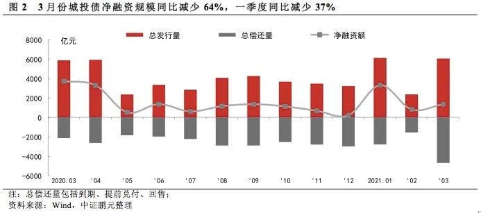 由于1月份的放量發行遠超2020年同期,2021年一季度城投債發行規模同比大幅增長34%,但凈融資規模同比減少37%。