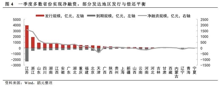 綜合1-3月份的情況來看,天津市和河南省仍是主要凈償還區域。云南省和遼寧省的凈償還規模也超過100億元。凈發行規模較大的省份主要位于東部沿海地區和中西部核心省份。江蘇、浙江兩省的凈發行規模均超過千億。四川、重慶兩地的凈發行規模分別達到423億元和111億元。同時,部分經濟發達地區如北京和上海的城投債發行與償還趨于均衡,以城投債資金進行基礎設施建設的需求較低。