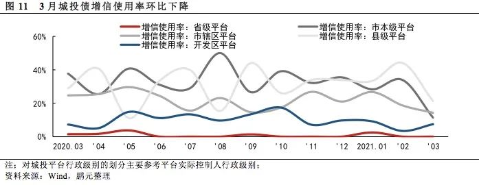 2021年3月份,城投債總體增信使用率為11.85%,較2月份環比下降6.1個百分點。就不同行政級別的主體來看,3月份除開發區平臺的增信使用率有所上升以外,其他級別城投平臺的增信使用率均環比下降??紤]到債券申報發行工作需要一段時間,增信使用率數據實際展現約1-2個月前的一級市場融資環境。從當前數據可見,2020年末城投債發行市場融資環境較好。