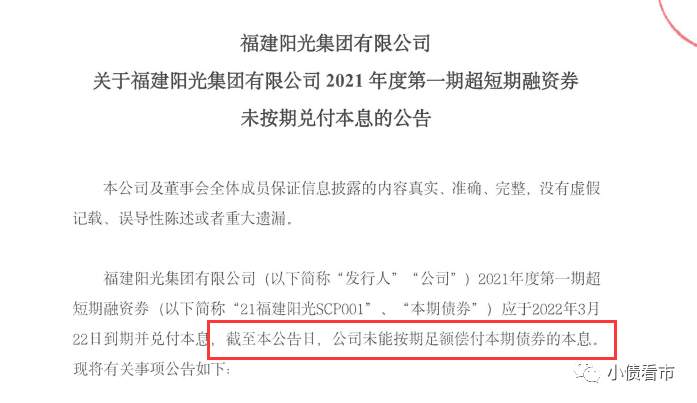 3月22日,福建陽光集團有限公司(以下簡稱“陽光集團”)公告稱,“21福建陽光SCP001”于2022年3月22日應(yīng)兌付本金5億元、利息2404萬元,因公司流動性出現(xiàn)階段性緊張,未能支付本期債券本息。