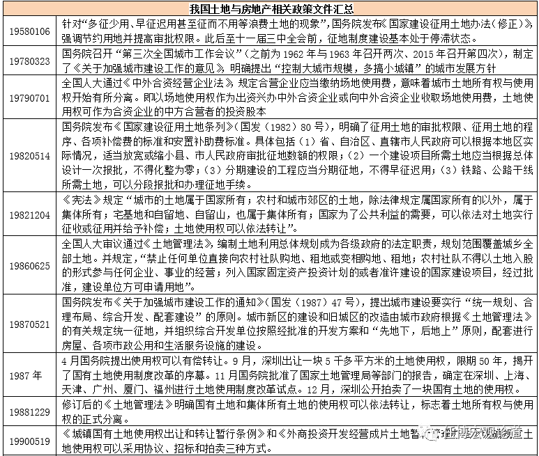 這一時期的土地制度變革有其自身的政策環境支撐,例如1979年7月國務院發布的《中外合資經營企業法》意味著城市土地所有權與使用權開始有所分離(即中方企業可以以場地使用權作為股權出資或象征性地收取場地使用費的形式設立中外合資企業等),1982年12月的《憲法》則規定“城市土地使用權可以依法轉讓”,1988年12月修訂的《土地管理法》明確國有土地和集體所有土地的使用權可以依法轉讓(標志著土地所有權與使用權的正式分離),1990年5月19日國務院發布的《城鎮國有土地使用權出讓和轉讓暫行條例》和《外商投資開發經營成片土地暫行管理辦法》明確規定土地使用權可以采用協議、招標和拍賣三種方式。