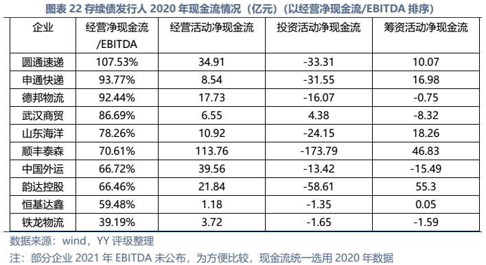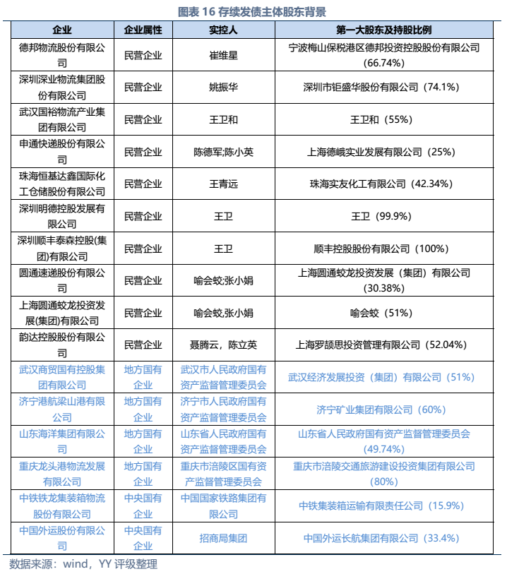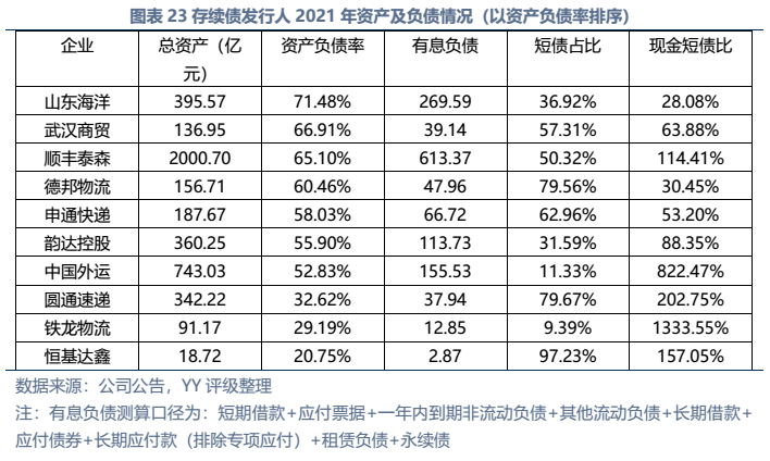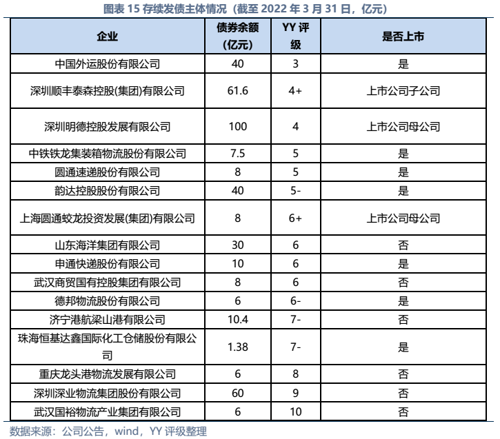 信用債市場方面,上市公司中高頻出現(xiàn)的“多式聯(lián)運(yùn)”、“智慧物流”、“供應(yīng)鏈管理”等概念在發(fā)債主體中熱度不高,主要仍以傳統(tǒng)物流企業(yè)為主。截至22年3月末,YY行業(yè)為物流的存續(xù)債主體共有16家,債券余額合計(jì)為402.88億元。行業(yè)整體毛利率不高(平均13%),杠桿率偏低(平均資產(chǎn)負(fù)債51.3%)。資質(zhì)方面,貨代龍頭中國外運(yùn)信用資質(zhì)最好,中鐵鐵龍集裝箱背靠國鐵集團(tuán)資源,信用資質(zhì)也較好。快遞細(xì)分領(lǐng)域集中度較高,市場格局相對穩(wěn)定,也有較強(qiáng)的經(jīng)營獲現(xiàn)能力支撐,順豐、韻達(dá)、圓通信用資質(zhì)尚可,申通快遞盈利較差,資質(zhì)稍弱。濟(jì)寧港航梁山港、珠海恒基達(dá)鑫、重慶龍頭港等工業(yè)品物流企業(yè)信用資質(zhì)較弱。