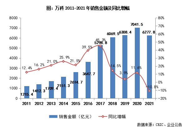 2021年,萬科累計(jì)實(shí)現(xiàn)合同銷售金額6277.8億元,銷售面積3807.8萬平方米,分別同比降低10.8%和18.4%;銷售均價(jià)16487元/平方米,同比增長9.3%。在百強(qiáng)房企整體業(yè)績規(guī)模同比回落的行業(yè)趨勢(shì)下,萬科2021年的銷售規(guī)模也出現(xiàn)負(fù)增長。