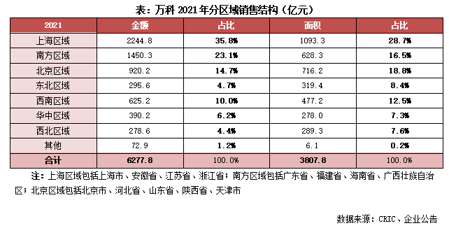 2021年萬科在全國43個(gè)城市市場(chǎng)的排名位列前三,其中20個(gè)城市排名第一,18個(gè)城市排名第二。從銷售結(jié)構(gòu)來看,2021年萬科業(yè)績貢獻(xiàn)最高的上海區(qū)域?qū)崿F(xiàn)銷售金額2244.8億元,銷售金額和銷售面積占比較去年分別提升至35.8%和28.7%。南方區(qū)域和北京區(qū)域的銷售業(yè)績貢獻(xiàn)度則分別達(dá)到23.1%和14.7%。
