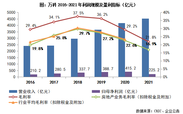 2021年,萬科實(shí)現(xiàn)營業(yè)收入4528億元,同比增長8%,其中來自房地產(chǎn)業(yè)務(wù)的結(jié)算收入4299.3億元。雖然營收規(guī)模保持增長,但主要受開發(fā)業(yè)務(wù)結(jié)算毛利率下滑的影響,萬科2021年僅實(shí)現(xiàn)毛利潤988.2億元,同比降低19.4%;凈利潤380.7億元、歸母凈利潤225.2億元,分別同比降低35.8%和45.7%。凈利潤繼1995年、2008年之后,出現(xiàn)上市31年以來的第三次下滑。