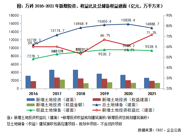 2021年,萬科保持量入為出的投資態(tài)度,全年新增土地投資規(guī)模略有降低。年內(nèi),萬科累計(jì)新獲取項(xiàng)目148個(gè),總規(guī)劃建筑面積2667.4萬平方米,權(quán)益規(guī)劃建筑面積1901.4萬平方米;權(quán)益地價(jià)總額約1401.5億元,新增項(xiàng)目平均地價(jià)為6942元/平方米。2021年,萬科新增投資權(quán)益占比71.3%,較2020年明顯提升且處于近年來的較高水平。