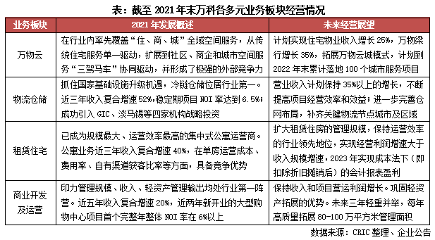 除了在地產(chǎn)開發(fā)主業(yè)穩(wěn)健發(fā)展,不斷提升產(chǎn)品和的服務(wù)競(jìng)爭(zhēng)力,2021年萬科繼續(xù)堅(jiān)持“城市配套服務(wù)商”的戰(zhàn)略定位,在物業(yè)服務(wù)、物流倉儲(chǔ)、住宅租賃、商業(yè)開發(fā)運(yùn)營等多元業(yè)務(wù)板塊實(shí)現(xiàn)有質(zhì)量發(fā)展。雖然對(duì)這部分多元業(yè)務(wù)的探索需要較大的投入,經(jīng)營收入和利潤規(guī)模短期內(nèi)也無法比及地產(chǎn)開發(fā)。但長期來看,經(jīng)營和服務(wù)業(yè)務(wù)的發(fā)展韌性更強(qiáng),能帶來穩(wěn)定的現(xiàn)金流,還能為未來公司價(jià)值增長提供更多的支撐。