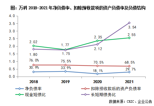 截至2021年末,萬科持有貨幣資金1493.5億元,有息負(fù)債總額2659.6億元;現(xiàn)金短債比和長短期債務(wù)比分別為2.55和3.54,凈負(fù)債率29.7%,負(fù)債結(jié)構(gòu)較2020年進(jìn)一步改善。平均融資成本4.11%,在整體融資環(huán)境趨緊的行業(yè)背景下,萬科得益于長期穩(wěn)健經(jīng)營的財(cái)務(wù)政策,凈負(fù)債率和融資成本穩(wěn)定在行業(yè)較低水平。扣除預(yù)收款項(xiàng)的資產(chǎn)負(fù)債率優(yōu)化至68.5%,三道紅線滿足綠檔達(dá)標(biāo)。2021年,萬科繼續(xù)保持行業(yè)領(lǐng)先的信用評(píng)級(jí),穆迪、標(biāo)普、惠譽(yù)分別給出了Baa1、BBB+、BBB+的“投資級(jí)”信用評(píng)級(jí)。