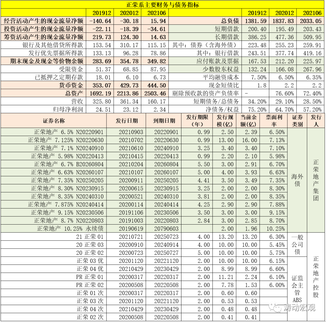 我們關注到,2022年4月13日正榮地產集團有2.10億美元的海外債到期、6月30日有16億美元的海外債到期、8月3日有2.85億美元的海外債到期以及9月1日有2.39億美元的海外債到期。