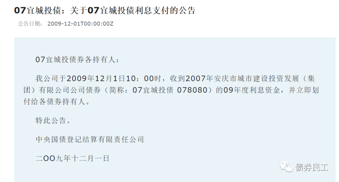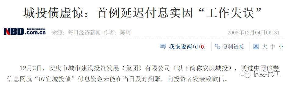 安慶市城市建設(shè)投資發(fā)展(集團(tuán))有限公司于2007年11月30日發(fā)行了“2007年安慶市城市建設(shè)投資發(fā)展(集團(tuán))有限公司公司債券”(以下簡(jiǎn)稱(chēng)“07宜城投債”),付息日為每年的11月30日。“07宜城投債”本應(yīng)該于2009年11月30日本期債券2009年度的支付債券利息,但是實(shí)際上支付時(shí)間為2009年12月1日,延遲了一天。安慶城投發(fā)布致歉信,明確利息延遲支付的原因是工作失誤。