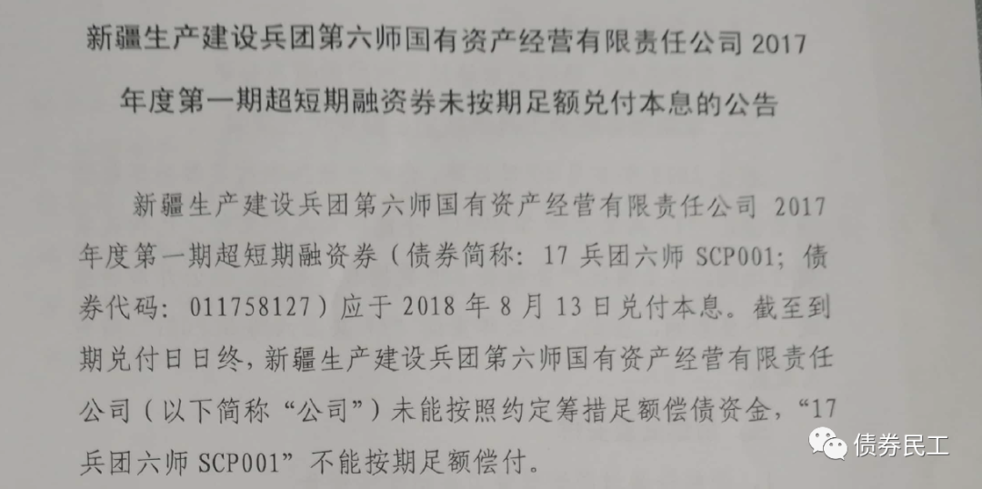 新疆生產(chǎn)建設(shè)兵團(tuán)第六師國(guó)有資產(chǎn)經(jīng)營(yíng)有限責(zé)任公司于2017年11月16日發(fā)行了“新疆生產(chǎn)建設(shè)兵團(tuán)第六師國(guó)有資產(chǎn)經(jīng)營(yíng)有限責(zé)任公司2017年度第一期超短期融資券”(以下簡(jiǎn)稱(chēng)“17兵團(tuán)六師SCP001”),債券到期日為2018年8月13日。新疆生產(chǎn)建設(shè)兵團(tuán)第六師國(guó)有資產(chǎn)經(jīng)營(yíng)有限責(zé)任公司于2018年8月13日發(fā)布公告,“17兵團(tuán)六師SCP001”未按期足額兌付債券本息。