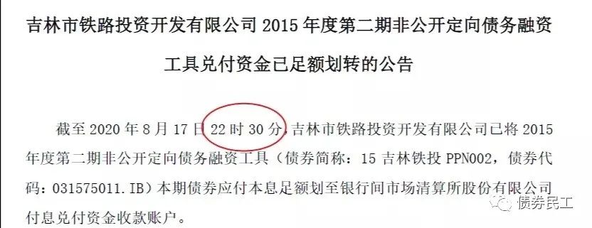 吉林市鐵路投資開(kāi)發(fā)有限公司于2015年8月17日發(fā)行了“ 吉林市鐵路投資開(kāi)發(fā)有限公司2015年度第二期非公開(kāi)定向債務(wù)融資工具”(以下簡(jiǎn)稱(chēng)“15吉林鐵投PPN002”),到期日為2020年8月17日。“15吉林鐵投PPN002”于2020年8月17日當(dāng)天17:00點(diǎn)前未完成資金劃付,出現(xiàn)了技術(shù)性違約。2020年8月17日晚上,發(fā)行人出具了“兌付資金已經(jīng)足額劃轉(zhuǎn)的公告”,已經(jīng)于17日晚上22點(diǎn)30分完成了資金的劃轉(zhuǎn)工作。