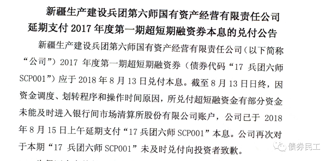 2018年8月15日上午,新疆生產(chǎn)建設(shè)兵團(tuán)第六師國(guó)有資產(chǎn)經(jīng)營(yíng)有限責(zé)任公司發(fā)布公告,已經(jīng)將“17兵團(tuán)六師SCP001”的債券本息足額支付到上清所。