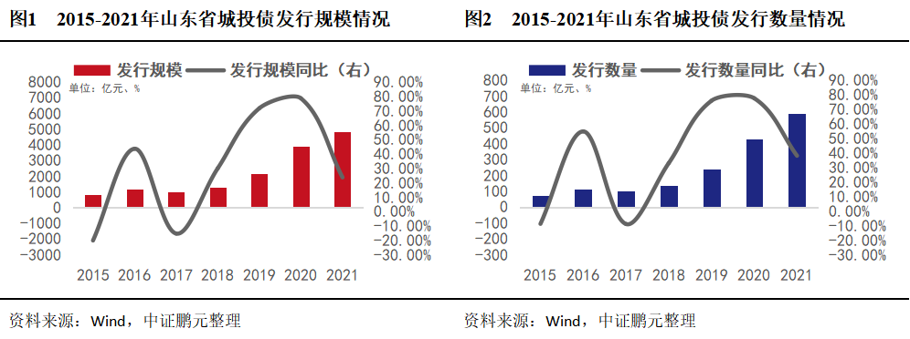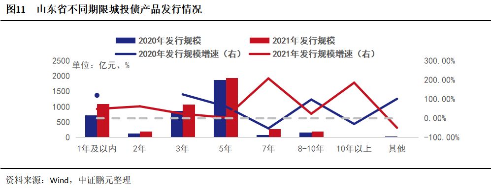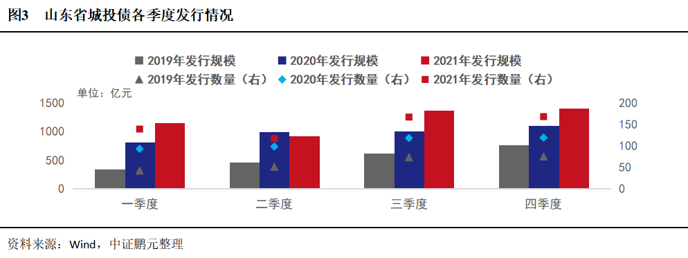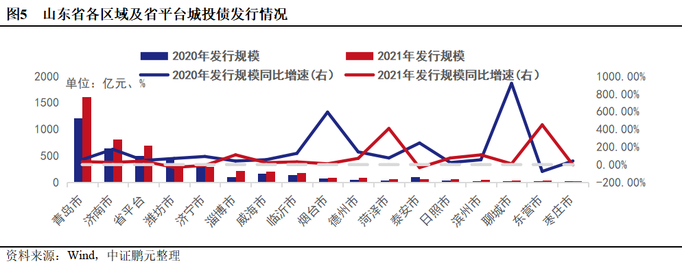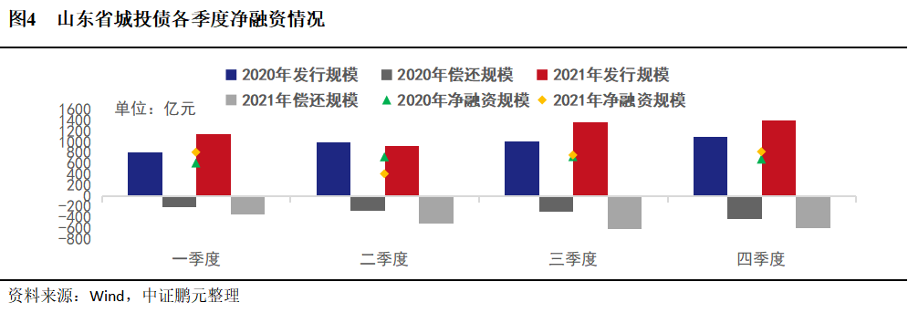 山東省2021年城投債發債總量保持增長,區域分化明顯。2021年山東城投發債規模和凈融資額均較2020年有所增加但增速放緩,同時季度波動明顯。
