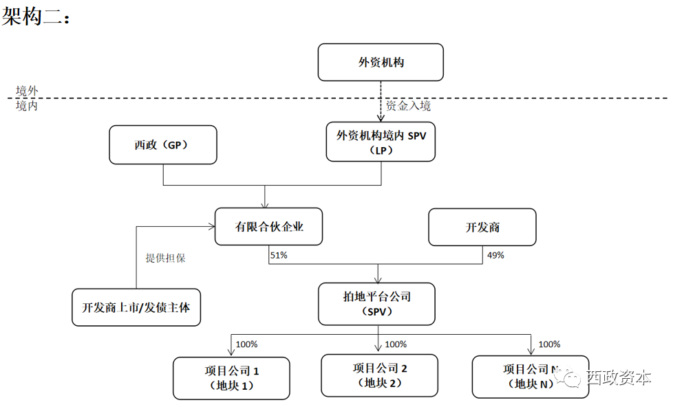在房企的融資業務中,經常涉及到自有資金的出資問題,前融機構提供的融資款與開發商的自有資金出資的比值就構成了配資比例。在配資款的注入過程中,開發商自有資金的出資主要有如下三種方式:第一種是開發商不需要出資,比如開發商和前融機構共同持股項目公司,但融資過程中開發商無需出資;第二種是開發商認繳但不實繳出資,比如我們在做融資產品的時候,開發商認購劣后級份額但不實繳,只是在我們前融無法退出時需承擔實繳義務,實際相當于增信措施;第三種是開發商必須按配資比例實繳出資,當然開發商也可能會尋找過橋資金解決自有資金的出資問題。為便于說明,我們就一些典型業務中的配資及產品架構逐一舉例說明。