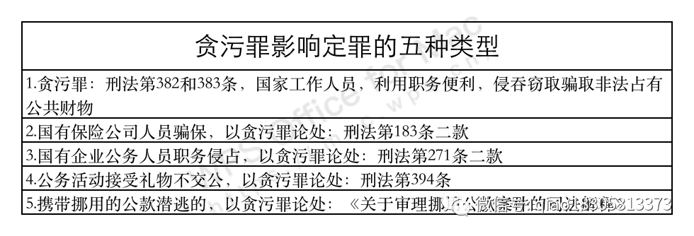 《刑法》382條和383條規(guī)定了貪污罪的表現(xiàn)形式處罰標(biāo)準(zhǔn),另外,還有三個條文明確以貪污罪論處,包括第183條二款的國有保險公司人員騙保,第271條二款國企人員職務(wù)侵占,第394條公務(wù)活動接受禮物應(yīng)交公而不交公。《關(guān)于審理挪用公款案件的司法解釋》規(guī)定了攜帶挪用公款潛逃的以貪污罪論處。