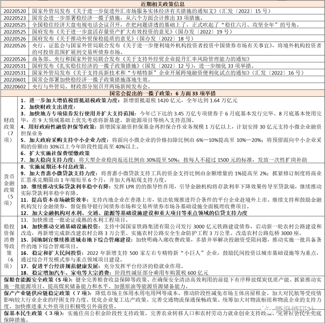 2022年4月18日,央行和外管局聯(lián)合發(fā)布《關(guān)于做好疫情防控和經(jīng)濟(jì)社會(huì)發(fā)展金融服務(wù)的通知》(也即23條,參見(jiàn)放松之路全面開(kāi)啟),已經(jīng)在很多方面?zhèn)鬟f了較為寬松的信號(hào),只不過(guò)當(dāng)時(shí)銀保監(jiān)會(huì)沒(méi)有參加。此次國(guó)常會(huì)提出的33項(xiàng)舉措中,與央行、外管局有關(guān)的貨幣金融政策有5項(xiàng)、其它配合性政策11項(xiàng)。為響應(yīng)國(guó)常會(huì)提出的33項(xiàng)舉措,2022年6月2日,央行與與外管局舉行新聞發(fā)布會(huì),解讀國(guó)常會(huì)部署有關(guān)扎實(shí)穩(wěn)住經(jīng)濟(jì)的金融政策。要點(diǎn)如下,