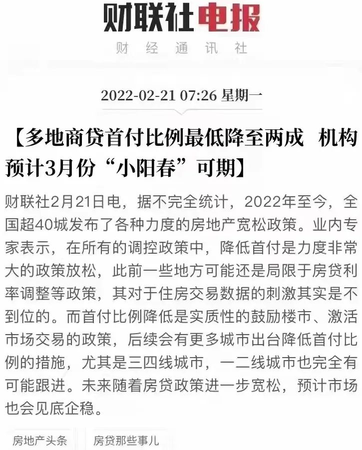 4、因城施策降低首付等還會(huì)很多,不值得驚訝。上周媒體報(bào)道,山東菏澤工行、建行、農(nóng)行自 2月14日起,名下無住房且無個(gè)人住房貸款記錄的購(gòu)房者,首付比例可執(zhí)行20%。