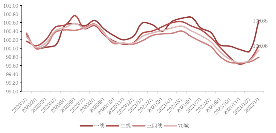 一線城市表現出強勁活力,房價同比出現相反上揚。1月4城整體同比上升4.4%,較上月漲幅不縮反擴0.02pcts。二線和三四線城市與70城整體走勢一致,同比分別上漲2.5%和0.5%,漲幅分別較上月收窄0.3pcts和0.4pcts。