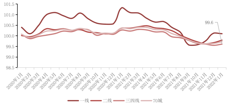 這主要是由于受2021年下半年市場下行影響,至2022年1月三四線城市二手住宅價格仍有0.7%的同比降幅。二手房市場不振下三四線城市購房者不具備充足的購房資金和心理預期投入新房市場。