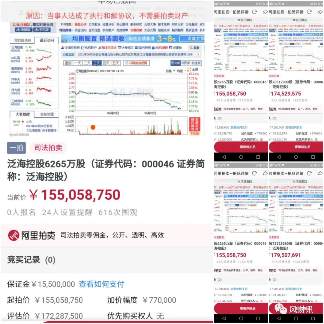 除此之外,風財訊留意到,本該在7月拍賣的泛海控股5筆股權,均已顯示“和解撤回”。