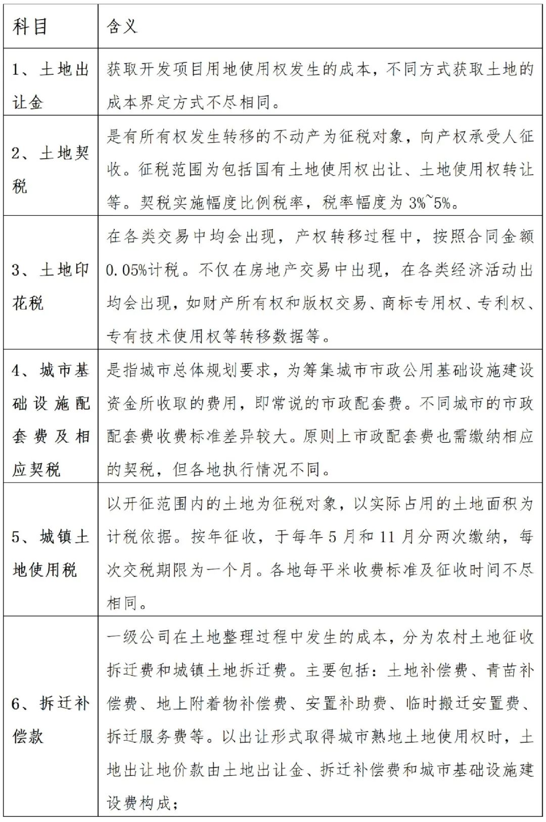 據上表可知,廣義上的土地成本組成 = 土地出讓金 + 契稅印花稅 + 市政配套費 + 拆遷補償款。(值得注意的是,以上項目在僅為稅費核算時歸入土地成本核算,但并不代表其本身屬于土地成本)